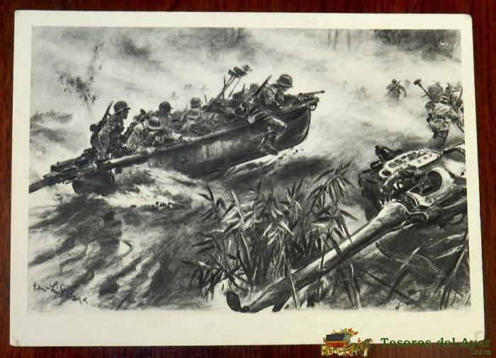 POSTAL BOTES DE ASALTO ALEMANES ATRAVESANDO UN RIO, II GUERRA MUNDIAL, MIDE 14,5 X 10,5 CM