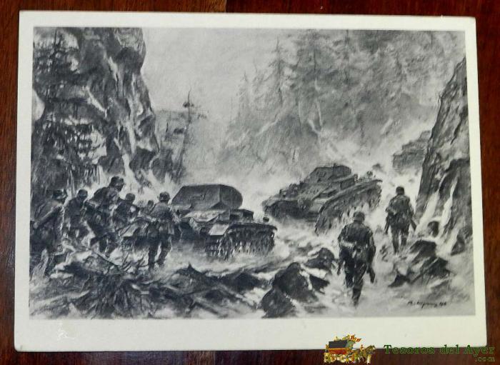 POSTAL TANQUES ALEMANES TOMANDO UN DESFILADERO, II GUERRA MUNDIAL, MIDE 14,5 X 10,5 CM