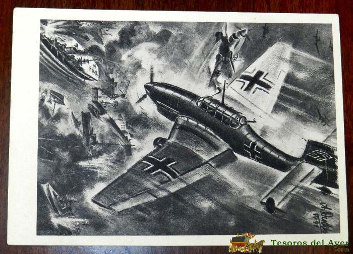 POSTAL DE UN PORTAVIONES INGLES ES BOMBARDEADO POR UN JU. 87, II GUERRA MUNDIAL, MIDE 14,5 X 10,5 CM