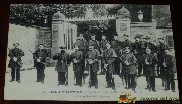 POSTAL SAN SEBASTIAN, GUIPUZCOA, ENTRADA AL PALACIO DE MIRAMAR Y GUARDIA POR LOS MIQUELETES, N. 100, ED. G. GALARZA, SAN SEBASTIAN, NO CIRCULADA, REVERSO CON PUBLICIDAD DE JOSEP COLOMER.