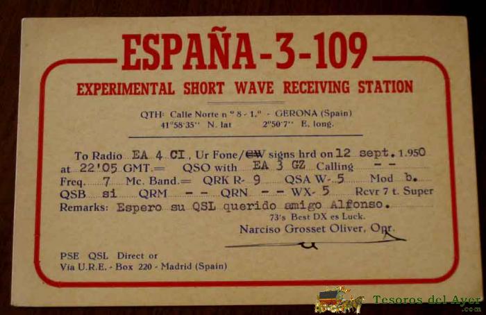 ANTIGUA TARJETA QSL . EA4CI - GERONA - AÑOS 50