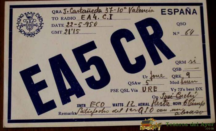 ANTIGUA TARJETA QSL . EA5CR - VALENCIA - AÑOS 50