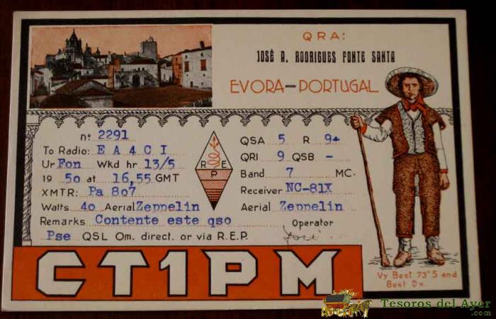 ANTIGUA TARJETA QSL . CT1PM . EVORA (PORTUGAL) - AÑOS 50