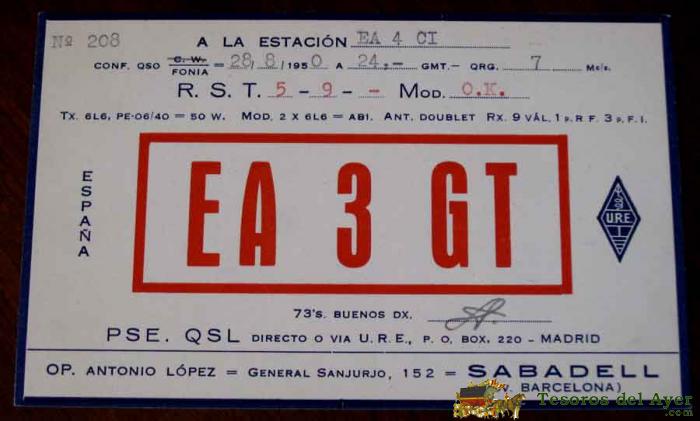 ANTIGUA TARJETA QSL . EA3GT - SABADELL (BARCELONA) - AÑOS 50