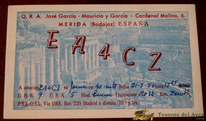 ANTIGUA TARJETA QSL . EA4CZ - MERIDA (BADAJOZ) - AÑOS 50