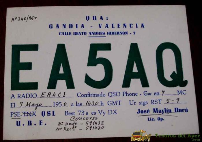 ANTIGUA TARJETA QSL . EA5AQ - GANDIA (VALENCIA) - AÑOS 50