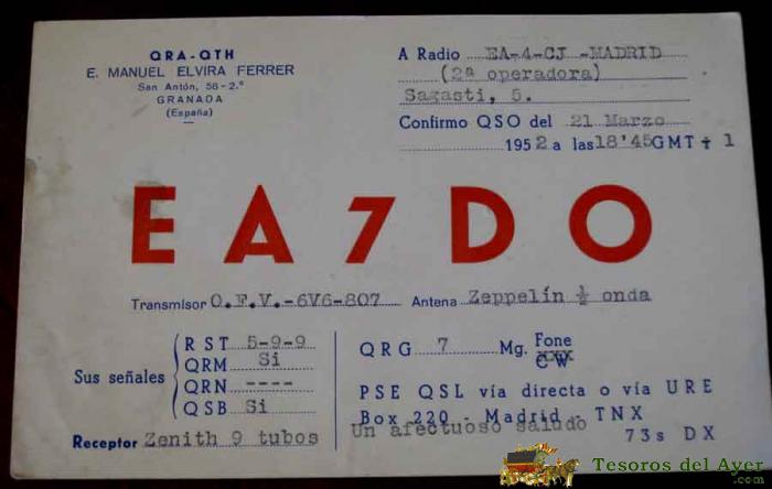 ANTIGUA TARJETA QSL . EA7DO - GRANADA - AÑOS 50