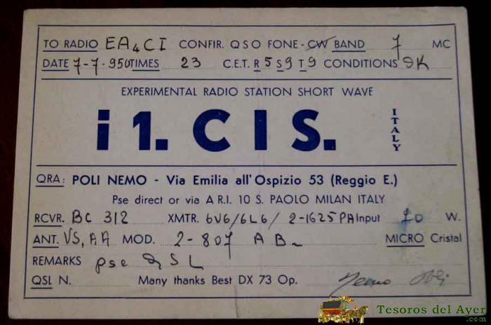 ANTIGUA TARJETA QSL . I1CIS - ITALIA - AÑOS 50