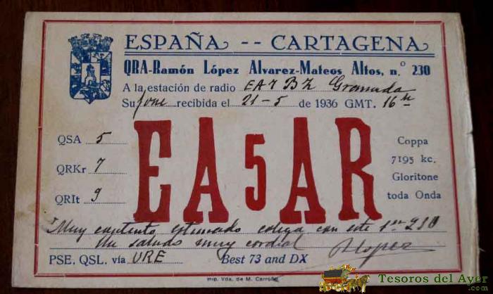 ANTIGUA TARJETA QSL DE LA REPUBLICA 21 DE MAYO DE 1936 . EA5AR - CARTAGENA