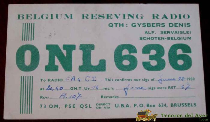 ANTIGUA TARJETA QSL - ONL636 - BELGICA - AÑOS 50