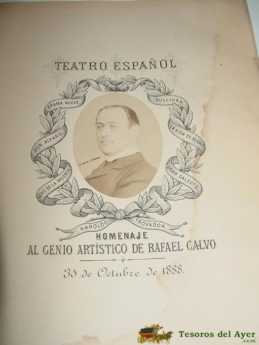 ANTIGUO LIBRO DEL HOMENAJE AL GENIO ARTISTICO DE RAFAEL CALVO. NOVIEMBRE DE 1888. TEATRO ESPAñOL - IMP. DE JOSé M. DUCAZCAL, MADRID, 1888 - MIDE 26,4 X 18,5 CMS. - 128 PAG - 1 FOTOGRAFIA ALBUMINA DE RETRATO PEGADO - FUE UNO DE LOS MáS GRANDES ACTORES DEL