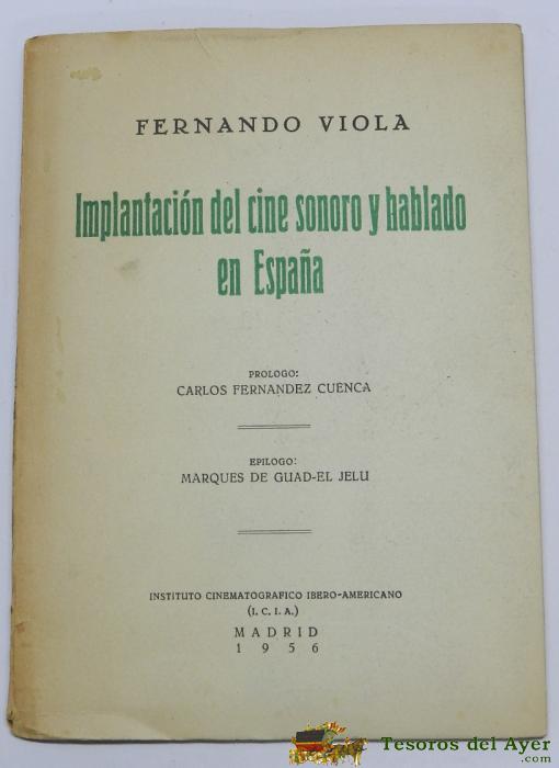 LIBRO IMPLANTACIóN DEL CINE SONORO Y HABLADO EN ESPAñA. POR VIOLA, FERNANDO, MADRID, INST. CINEMATOGRáF. IBERO-AMERICANO, 1956. PRóL. CARLOS FERNáNDEZ CUENCA. EPíLOGO MARQUéS DE GUAD-EL-JELU. MIDE 18 X 13 CM. 92 P. RúSTICA. TIENE UNA DEDICATORIA Y FIRMA M
