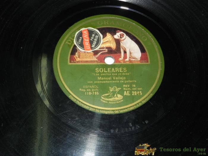 ANTIGUO DISCO DE PIZARRA DE MANUEL VALLEJO, SOLEARES ( LOS PASITOS QUE YO DABA) / FANDANGOS POR SOLEA (POR AQUEL QUE NAZCA CANTANDO), AE 2945, BUEN ESTADO DE CONSERVACION, DISCO GRAMOFONO.