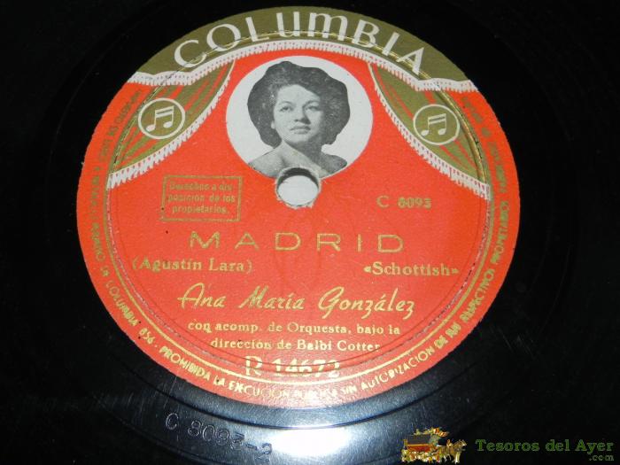 DISCO PIZARRA. ANA MARIA GONZALEZ- MADRID (SCHOTISH, AGUSTIN LARA) - REVANCHA (BOLERO AGUSTIN LARA) - R 14672. ED. COLUMBIA.