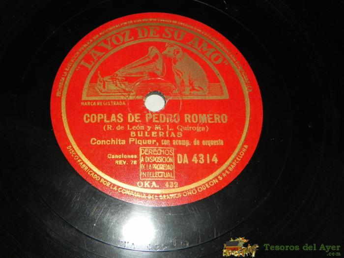 ANTIGUO DISCO DE PIZARRA DE 78 RPM - CONCHITA PIQUER CON ORQUESTA - JUDAS / COPLAS DE PEDRO ROMERO - LA VOZ DE SU AMO DA 4314 - OKA 432 / 433 .