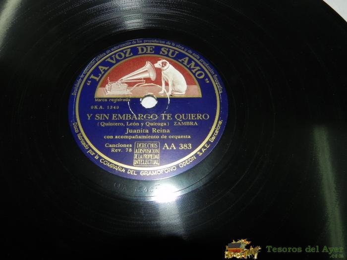 ANTIGUO DISCO DE PIZARRA DE JUANITA REINA - PLAZA DE SANTA MARTA (TANGUILLO); Y SIN EMBARGO TE QUIERO (ZAMBRA) - CON ACOMPAñAMIENTO DE ORQUESTA - ED. LA VOZ DE SU AMO - AA 383.
