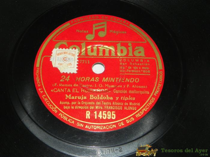 ANTIGUO DISCO DE PIZARRA DE MARUJA BOLDOBA Y TRIPLES / CLAVELES GRANADINOS (PASODOBLE) / CANTA EL RUISEÑOR (COLUMBIA R 14595).