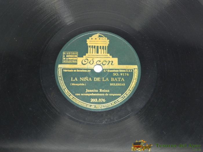 DISCO DE PIZARRA DE JUANITA REINA ACOMPAñADA DE ORQUESTA - LA NIñA DE LA BATA (SO9176) / BRONCE GITANO (SO9178) - ODEON 203.876. BUEN ESTADO.