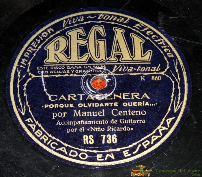 DISCO DE PIZARRA DE MANUEL CENTENO, ACOMP. GUITARRA NIÑO RICARDO, MALAGUEÑA (BIEN SABE DIOS) / CARTAGENERA (PORQUE OLVIDARTE QUERIA), ED. REGAL, RS 736, TIENE 4 GOLPECITOS EN LOS BORDES, PERO NO PARECEN QUE AFECTEN AL SONIDO DEL DISCO.