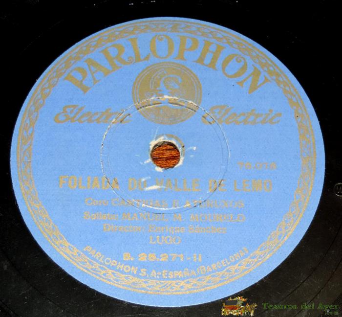 DISCO DE PIZARRA DEL CORO CANTIGAS E ATURUXOS, FOLIADA DO VALLE DE LEMO / O MOZO, DIRECTOR ENRIQUE SANCHEZ, PARLOPHON 25.271, BUEN ESTADO.
