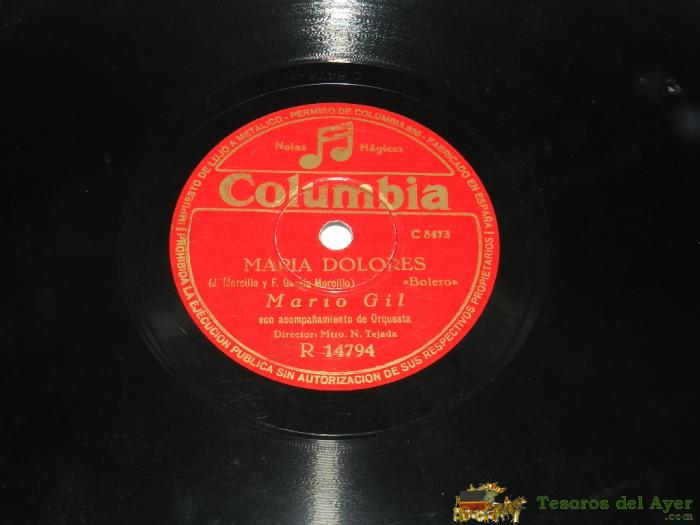 DISCO DE PIZARRA DE MARIO GIL, MARIA DOLORES / UN ANGEL FUE, ACOMP. DE ORQUESTA , DIR. TEJADA, COLUMBIA R 14794.