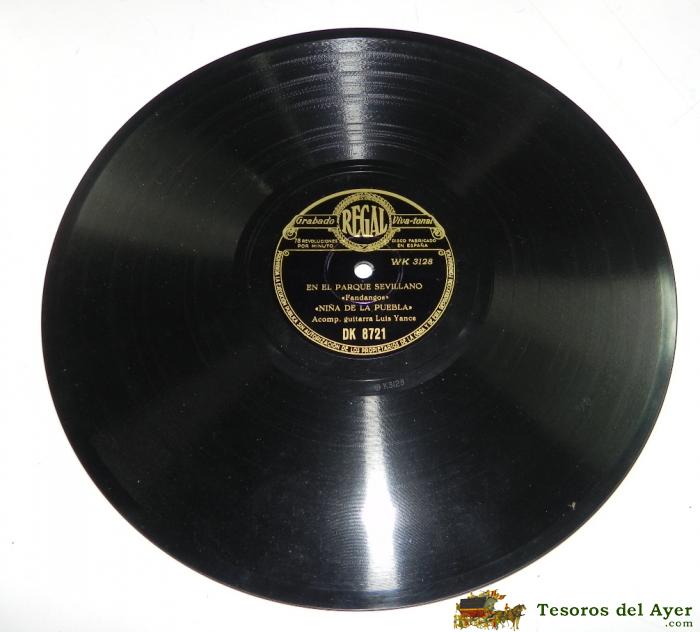 DISCO DE PIZARRA DE LA NIÑA DE LA PUEBLA. EN LOS PUEBLOS DE MI ANDALUCIA (CAMPANILLEROS) - EN EL PARQUE SEVILLANO (FANDANGOS). REGAL DK8721. BUEN ESTADO.