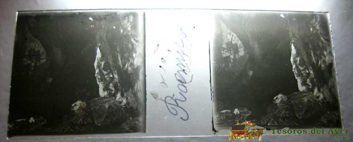 ANTIGUA FOTOGRAFIA ESTEREOSCOPICA DE COVADONGA, CUEVA - ASTURIAS - EN CRISTAL - MIDE 10,7 X 4,4 CMS