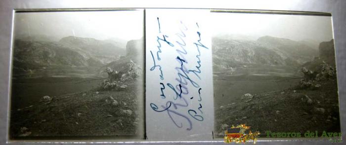 ANTIGUA FOTOGRAFIA ESTEREOSCOPICA DE COVADONGA - ASTURIAS - EN CRISTAL - LAGOS Y PICOS DE EUROPA - MIDE 10,7 X 4,4 CMS
