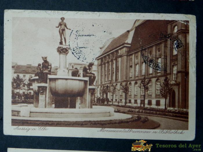 ANTIGUA POSTAL, AUSSIG, FUENTE MONUMENTO Y BIBLIOTECA, CIRCULADA
