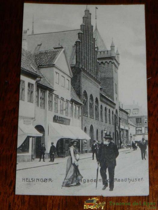 ANTIGUA FOTO POSTAL, HELSINGOR, MURO DE PIEDRA CON EL AYUNTAMIENTO, SIN CIRCULAR, VIDENSKABERNES, HELSINGøR, STENGæRDE MED RåDHUSET, UCIRKULERET