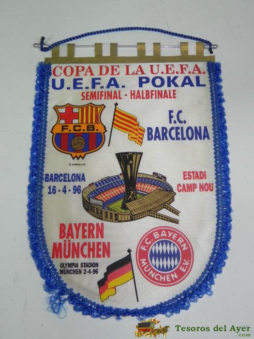 ANTIGUO BANDERIN, FUTBOL CLUB BARCELONA, BAYERN DE MUNICH, SEMIFINAL COPA DE LA UEFA, 2-04-1996, 16-04-1996, MIDE 44 X 30 CMS