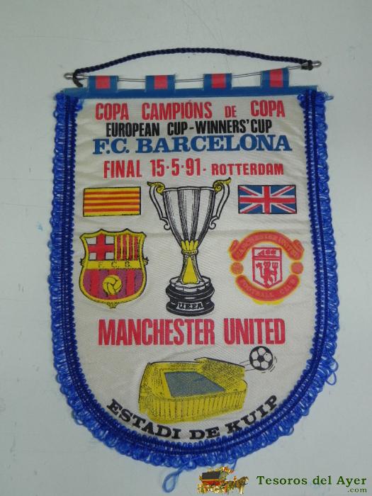 ANTIGUO BANDERIN, FUTBOL CLUB BARCELONA, MANCHESTER UNITED, FINA COPA DE CAMPEONES, 15-05-1991, MIDE 44 X 30 CMS