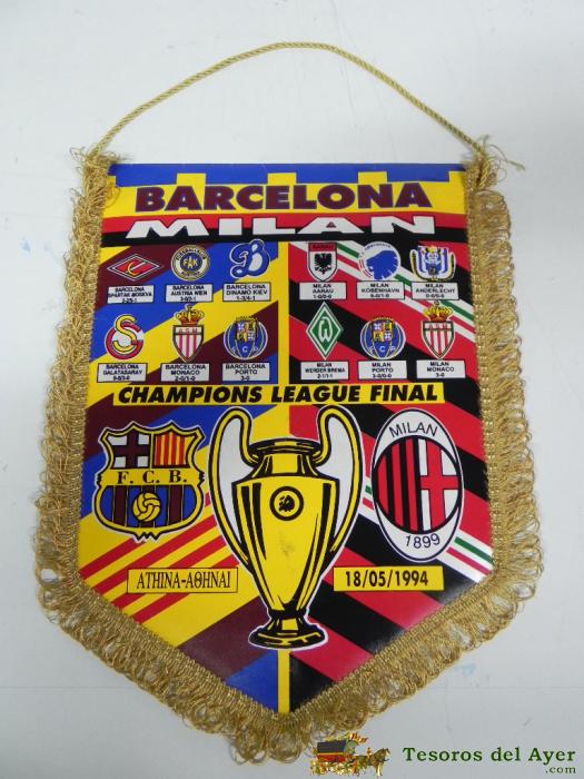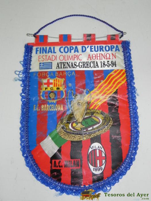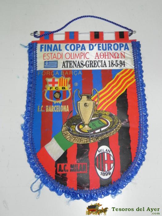 ANTIGUO BANDERIN, FUTBOL CLUB BARCELONA, A.C MILAN, FINAL COPA DE EUROPA, 18-05-1994, MIDE 44 X 30 CMS
