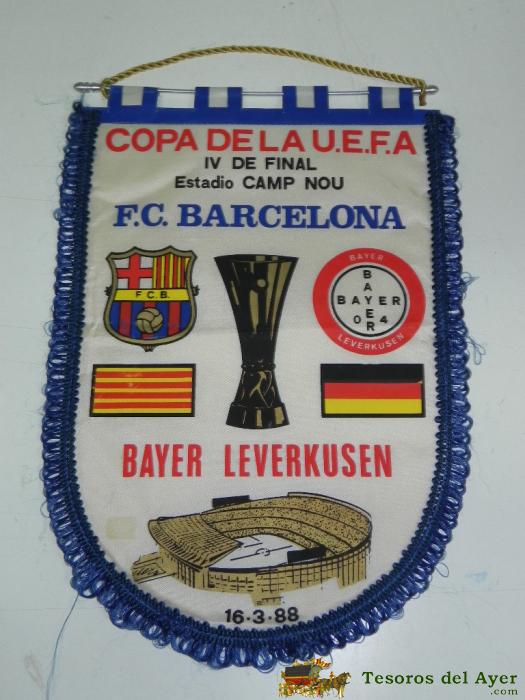 ANTIGUO BANDERIN, FUTBOL CLUB BARCELONA, BAYER LEVERKUSEN, CUARTOS DE FINAL COPA DE LA UEFA, 16-03-1988, MIDE 44 X 30 CMS