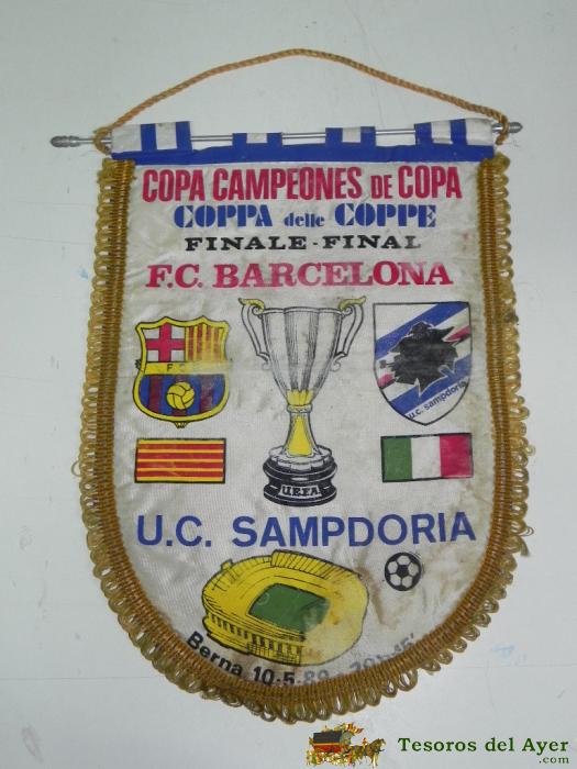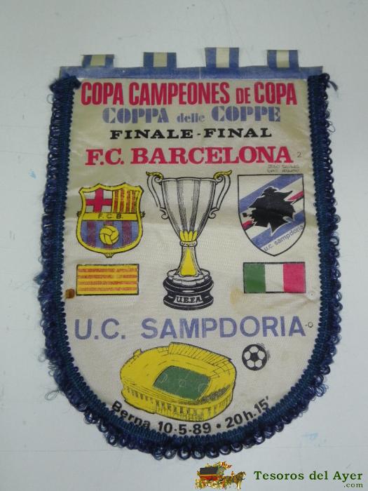 ANTIGUO BANDERIN, FUTBOL CLUB BARCELONA, U.C SAMPDORIA, FINAL COPA DE CAMPEONES DE COPA, 10-05-1989, MIDE 44 X 30 CMS