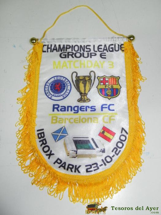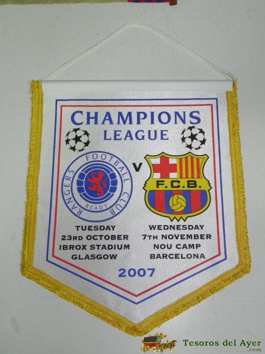 ANTIGUO BANDERIN, FUTBOL CLUB BARCELONA, F.C RANGERS, CHAMPIONS LEAGUE, 2007, MIDE 44 X 30 CMS