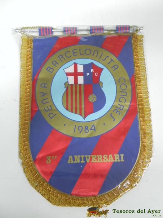 ANTIGUO BANDERIN, FUTBOL CLUB BARCELONA, 1984, TERCER ANIVERSARIO, MIDE 35 X 26 CMS
