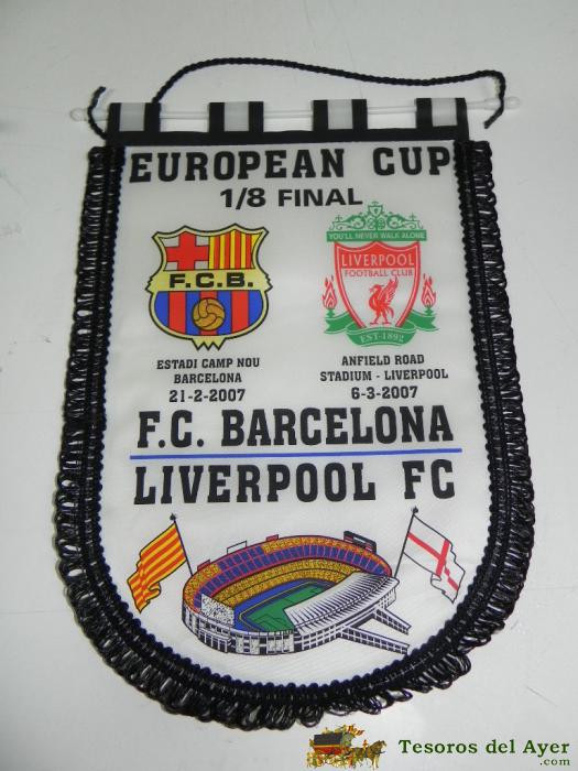 ANTIGUO BANDERIN, FUTBOL CLUB BARCELONA, LIVERPOOL F.C., OCTAVOS DE FINAL COPA DE EUROPA, 2007, MIDE 35 X 26 CMS