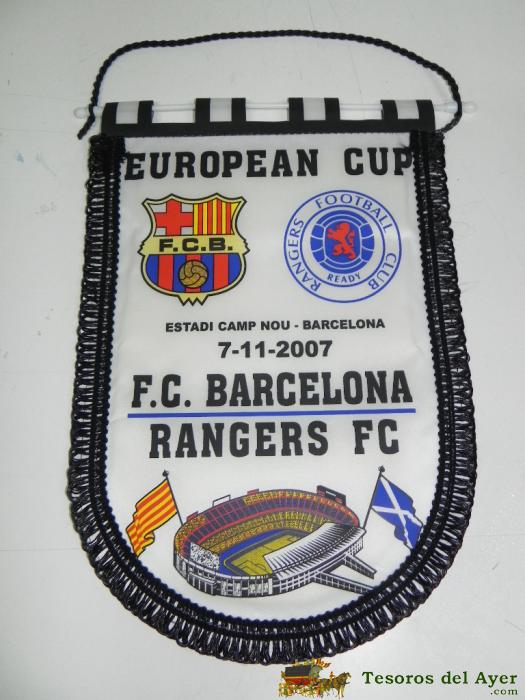ANTIGUO BANDERIN, FUTBOL CLUB BARCELONA, RANGERS F.C., COPA DE EUROPA, 07-11-2007, MIDE 35 X 26 CMS