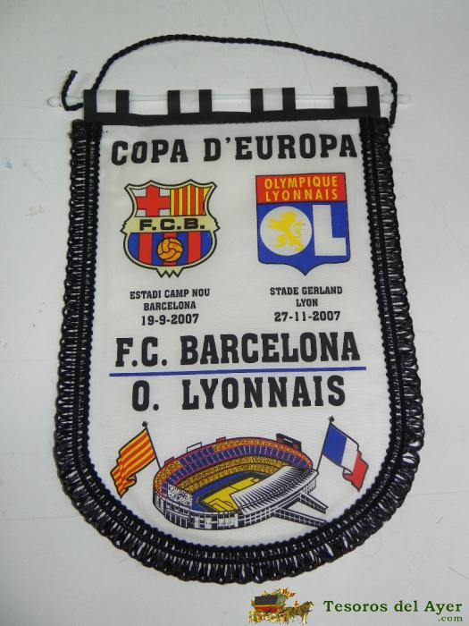 ANTIGUO BANDERIN, FUTBOL CLUB BARCELONA, O. LYONNAIS, COPA DE EUROPA, 2007, MIDE 35 X 26 CMS