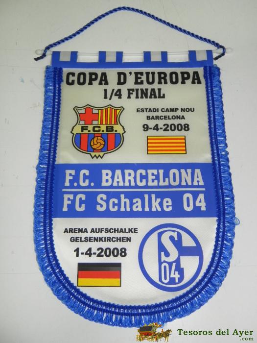 ANTIGUO BANDERIN, FUTBOL CLUB BARCELONA, F.C SCHALKE, CUARTOS DE FINAL COPA DE EUROPA, 2008, MIDE 35 X 26 CMS