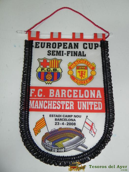 ANTIGUO BANDERIN, FUTBOL CLUB BARCELONA, MANCHESTER UNITED, SEMIFINAL COPA EUROPA, 23-04-2008, MIDE 35 X 26 CMS