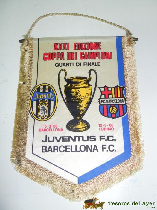 ANTIGUO BANDERIN, FUTBOL CLUB BARCELONA, JUVENTUS F.C., CUARTOS DE FINAL COPA DE CAMPEONES, 1986, MIDE 35 X 26 CMS