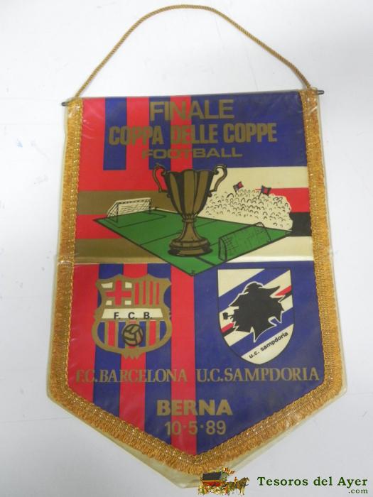 ANTIGUO BANDERIN, FUTBOL CLUB BARCELONA, U.C. SAMPDORIA, FINAL COPA DE COPAS, 10-05-1989, MIDE 35 X 26 CMS