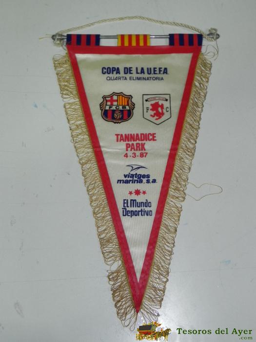 ANTIGUO BANDERIN, FUTBOL CLUB BARCELONA, MANCHESTER UNITED, CUARTA ELIMINATORIA COPA DE LA UEFA, 1987, MIDE 38 CMS DE LARGO APROX.