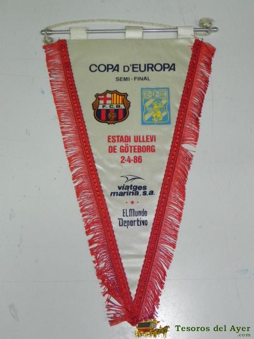 ANTIGUO BANDERIN, FUTBOL CLUB BARCELONA, I.F.K., CUARTA SEMIFINAL COPA DE EUROPA, 1986, MIDE 38 CMS DE LARGO APROX.
