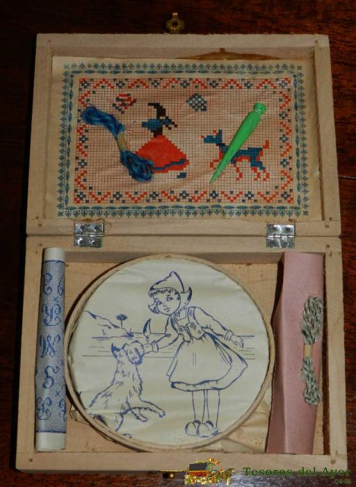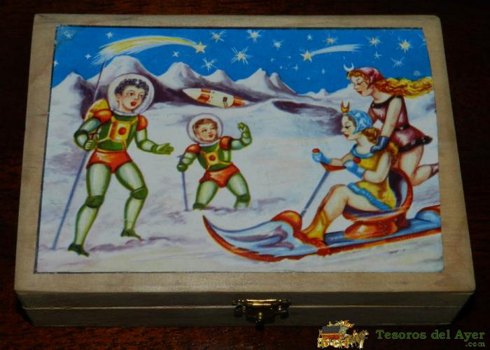 ANTIGUA CAJA DE LABORES PARA NIÑA, AÑOS 40 O 50, DE MADERA, COMPLETO TAL COMO SE VE EN LAS FOTOGRAFIAS PUESTAS, MIDE 16 X 11,5 X 4 CMS. CON MOTIVO DE CIENCIA FICCION, COHETE, MARTE ETC...