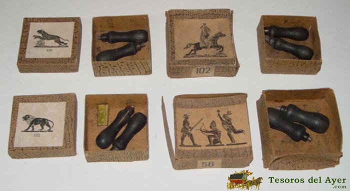 4 ANTIGUAS CAJAS PARA MOLDES PARA FIGURA DE PLOMO, LE FALTAN LOS MOLDES - TAL COMO SE VE EN LAS FOTOS, MIDEN 9 X 9 CMS. APROXIMADAMENTE, VER TODAS LAS FOTOS QUE HEMOS PUESTO.