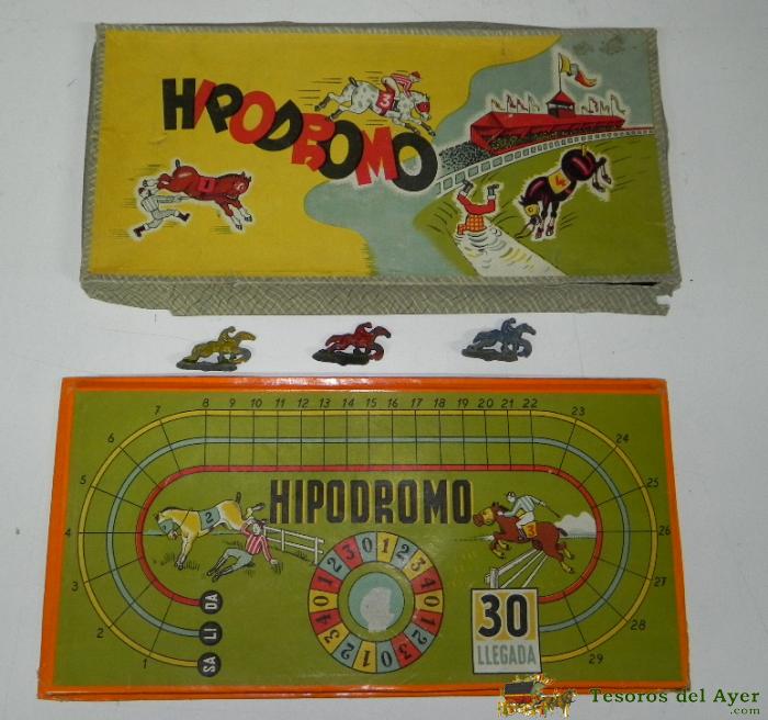 ANTIGUO JUEGO DE MESA HIPODROMO, TAL COMO SE VE EN LAS FOTOGRAFIAS, COMPLETO CON INSTRUCCIONES Y LOS CABALLOS DE PLOMO, SOLAMENTE LE FALTA LA FLECHA DEL CENTRO DEL JUEGO, TODO ANTIGUO, LA CAJA MIDE 35 X 16,5 X 2,5 CMS. AÑOS 30