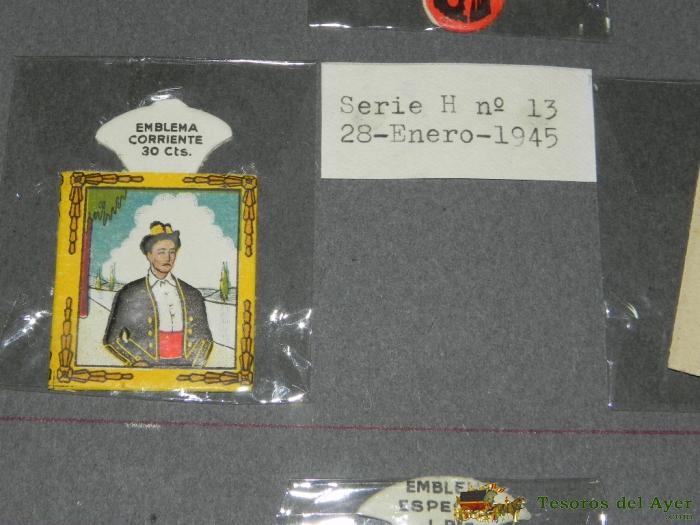 EMBLEMA DE AUXILIO SOCIAL, PRECIO 30 CTS, TAMAÑO 2,5 X 4 CMS, SERIE H, NUMERO 13, 28 ENERO DE 1945